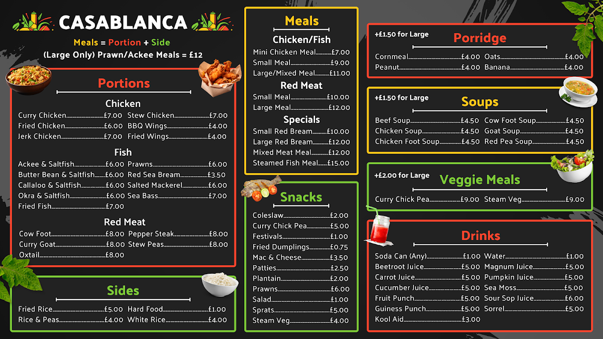 Welcome to Casablanca, an intimate haven for authentic Caribbean cuisine nestled at 170 Sandringham Rd, London. This gem combines culinary tradition with vibrant flavors, showcasing a menu that caters to all diners. Their signature dishes include the Butter Bean & Saltfish, which delivers a delightful taste of the sea, and a satisfying Curry Chick Pea for veggie lovers.